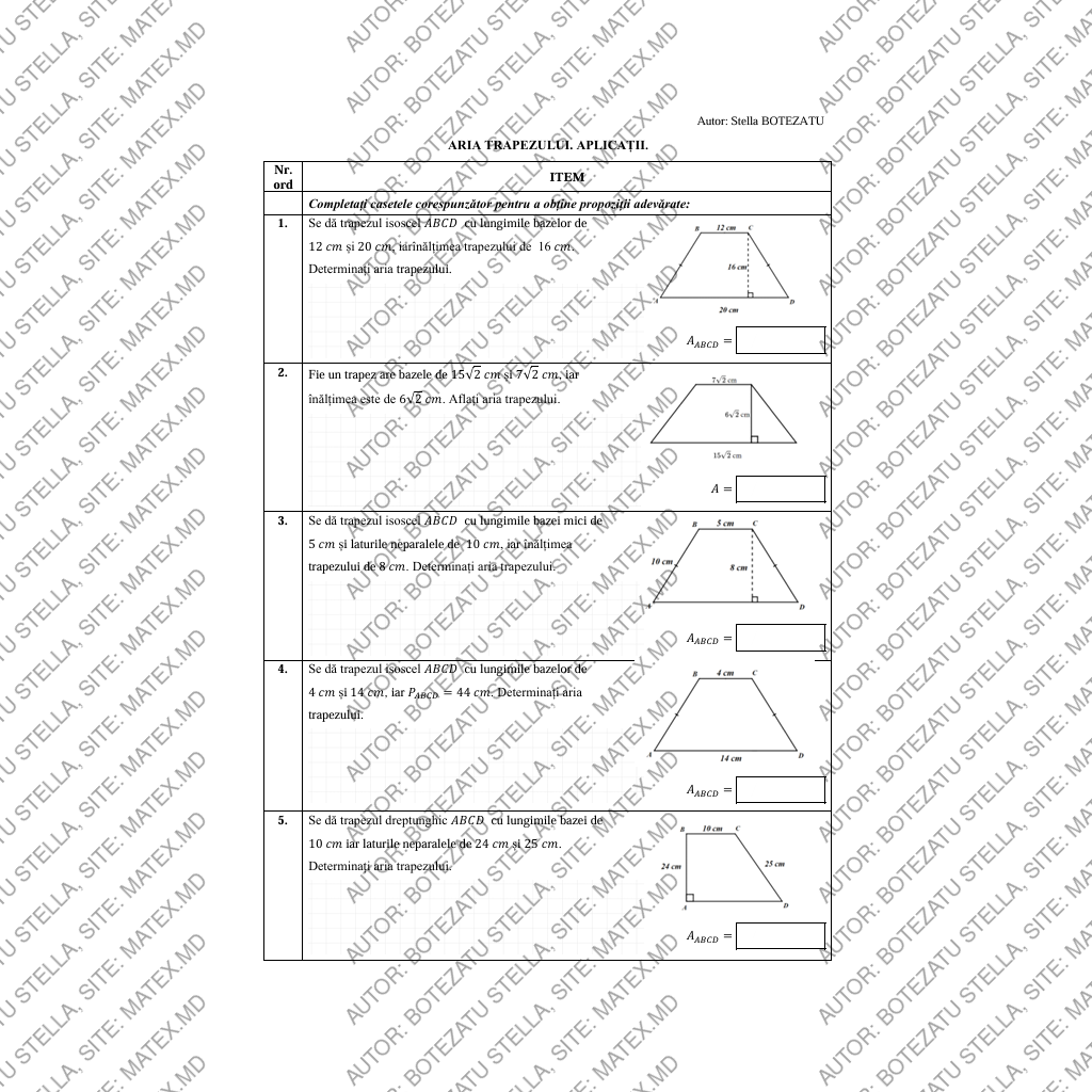 ✔ Include exerciții diverse: calculul ariei, determinarea bazelor, calculul înălțimii, trapeze cu unghiuri speciale, probleme cu linia mijlocie.